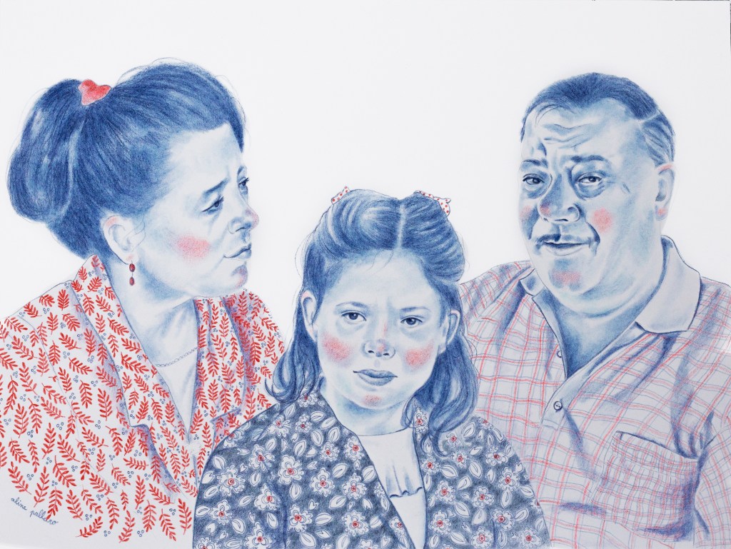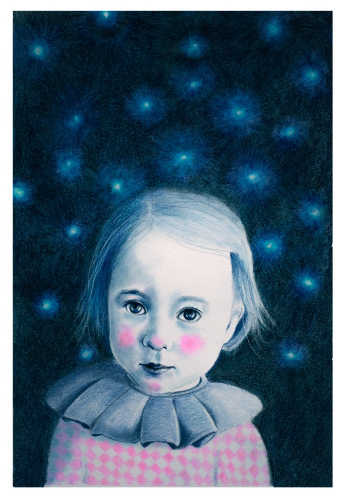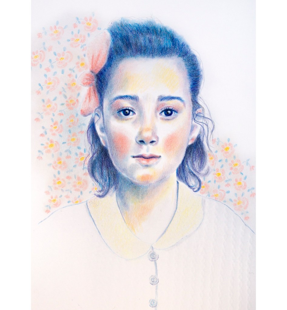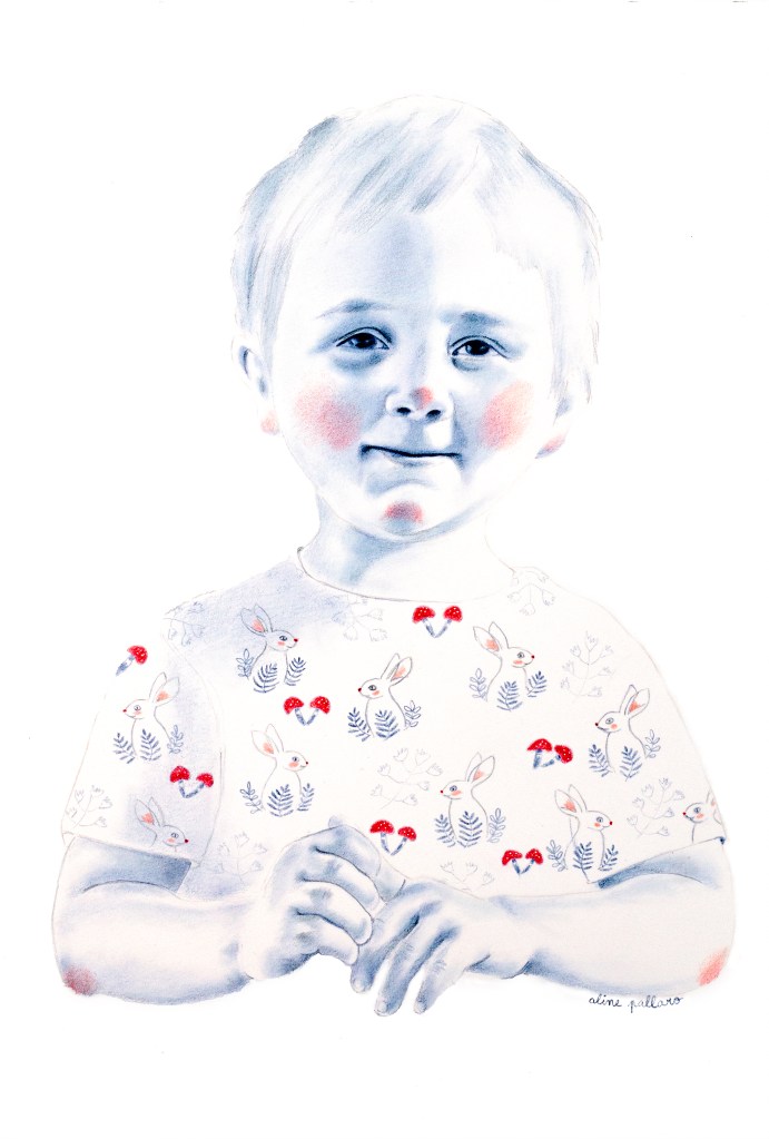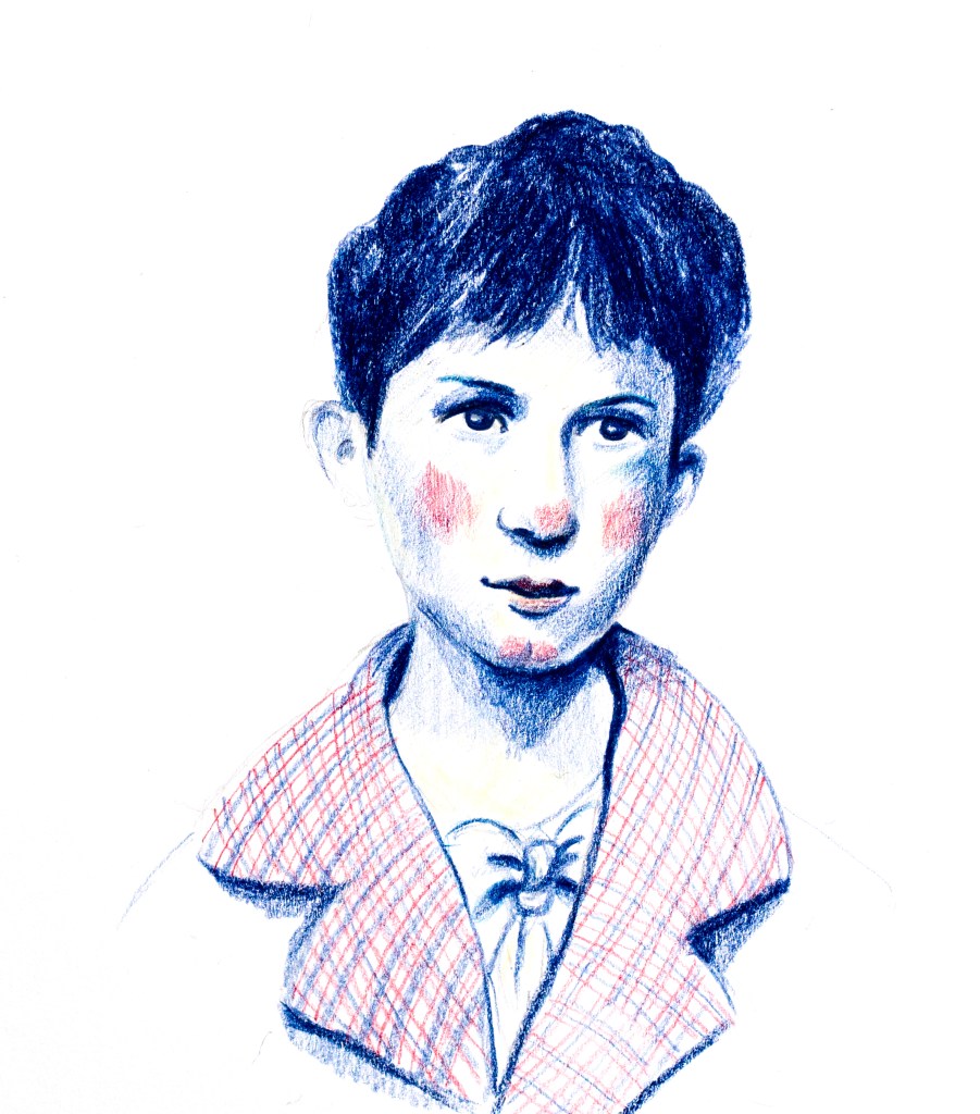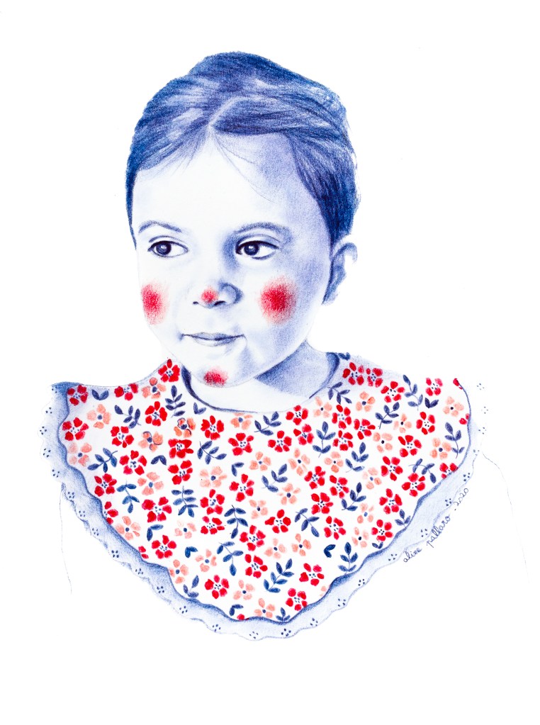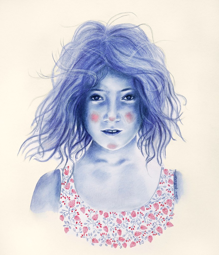 Ces portraits ont été réalisés aux crayons de couleurs Polychromos, bleu indanthrène et écarlate intense, avec des ajouts à l’encre sur du papier 250g.