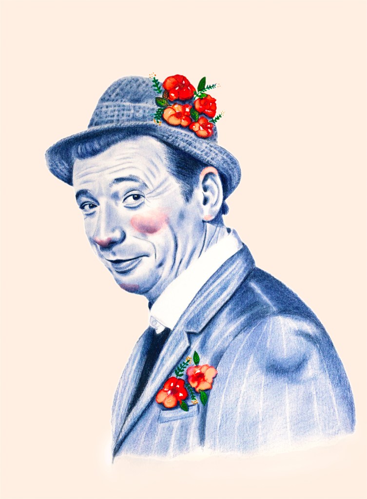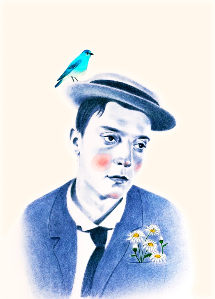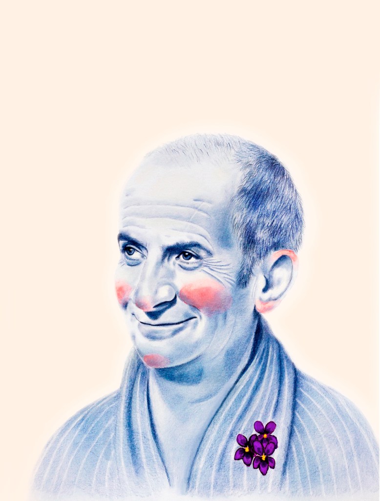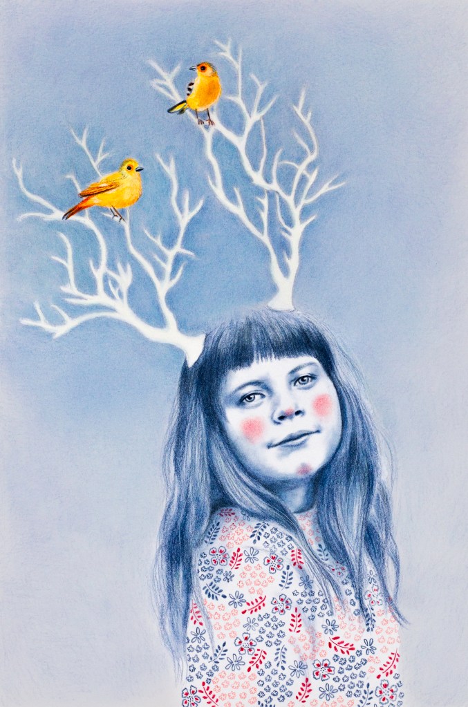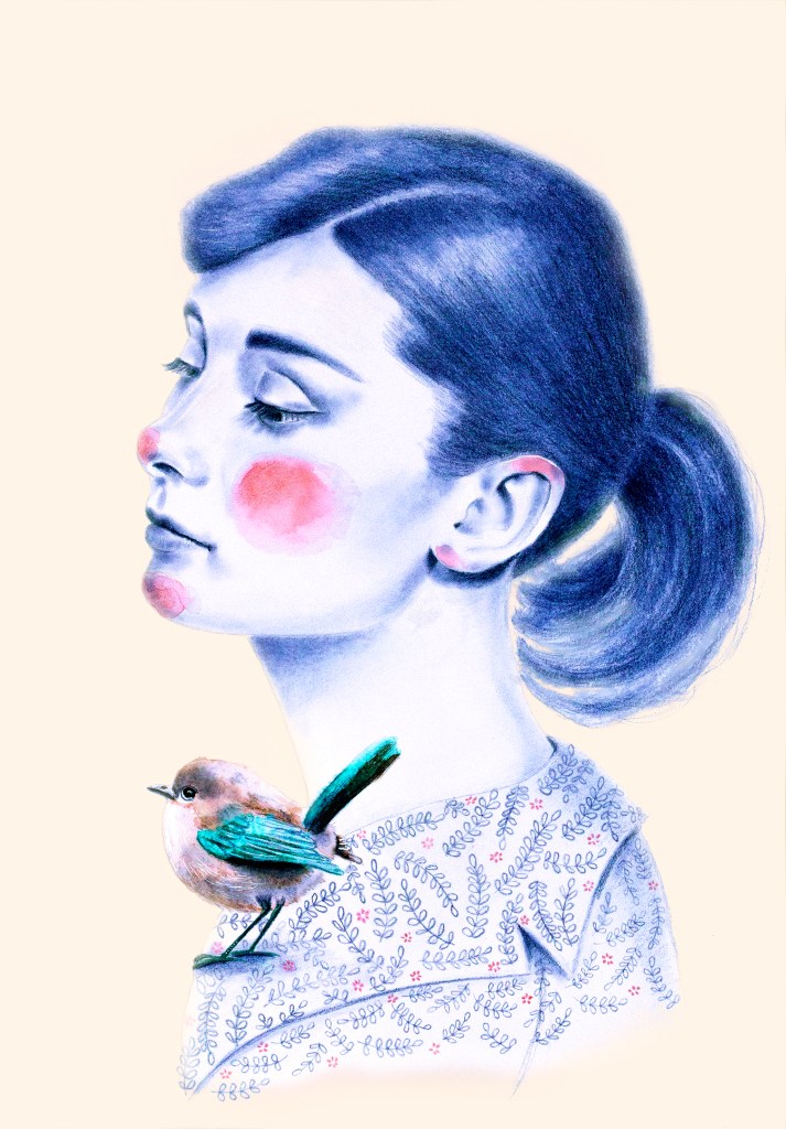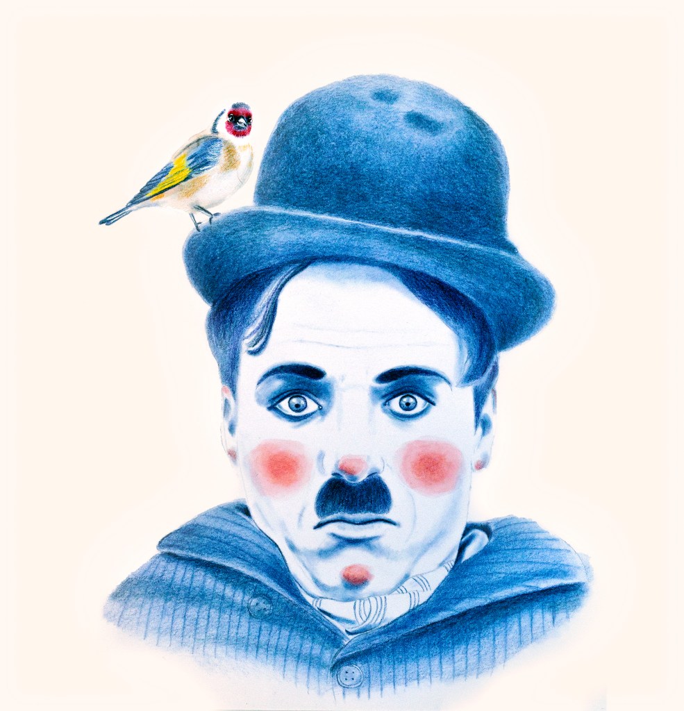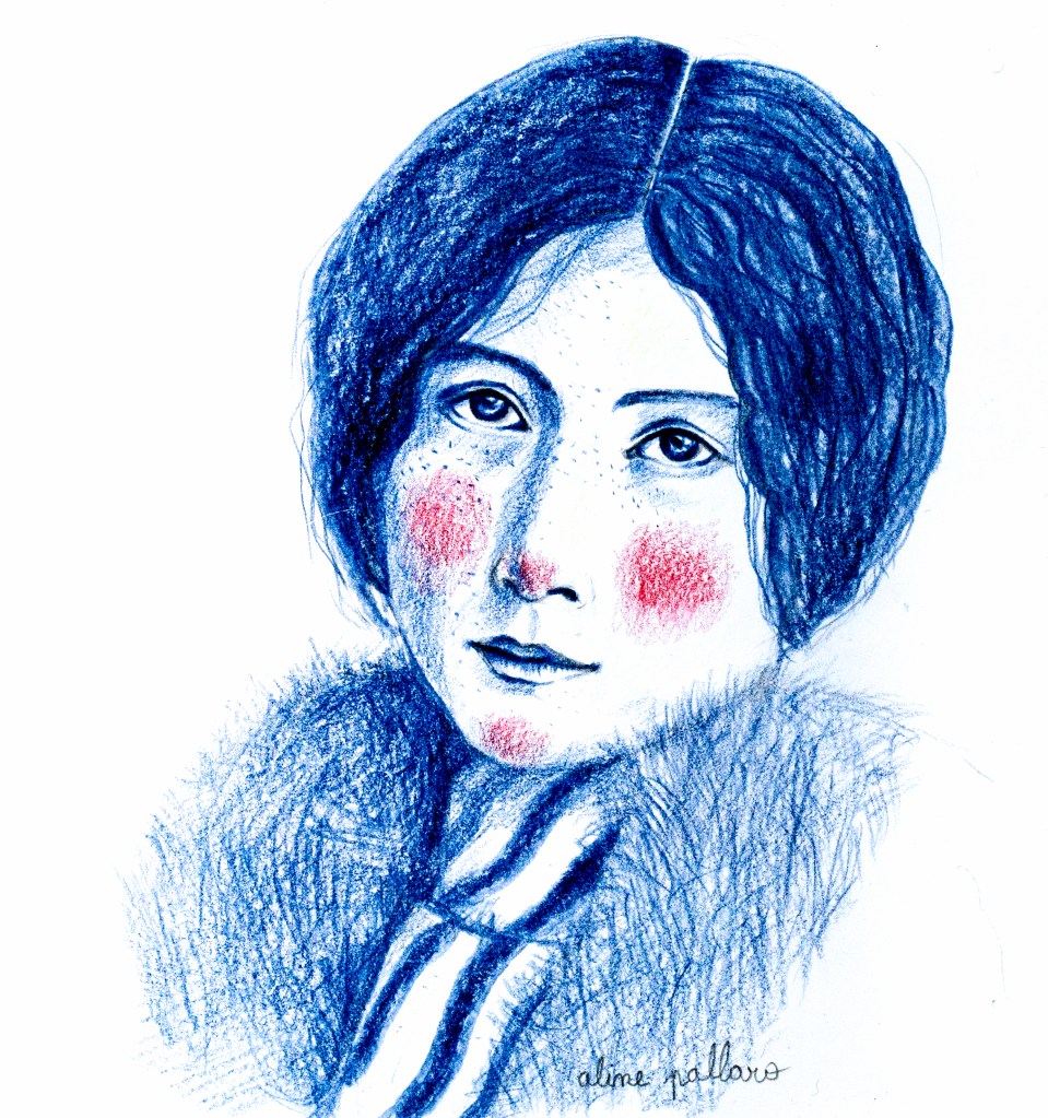 Ces portraits ont été réalisés aux crayons de couleurs Polychromos, bleu indanthrène et écarlate intense, avec des ajouts à l’encre sur du papier 250g.